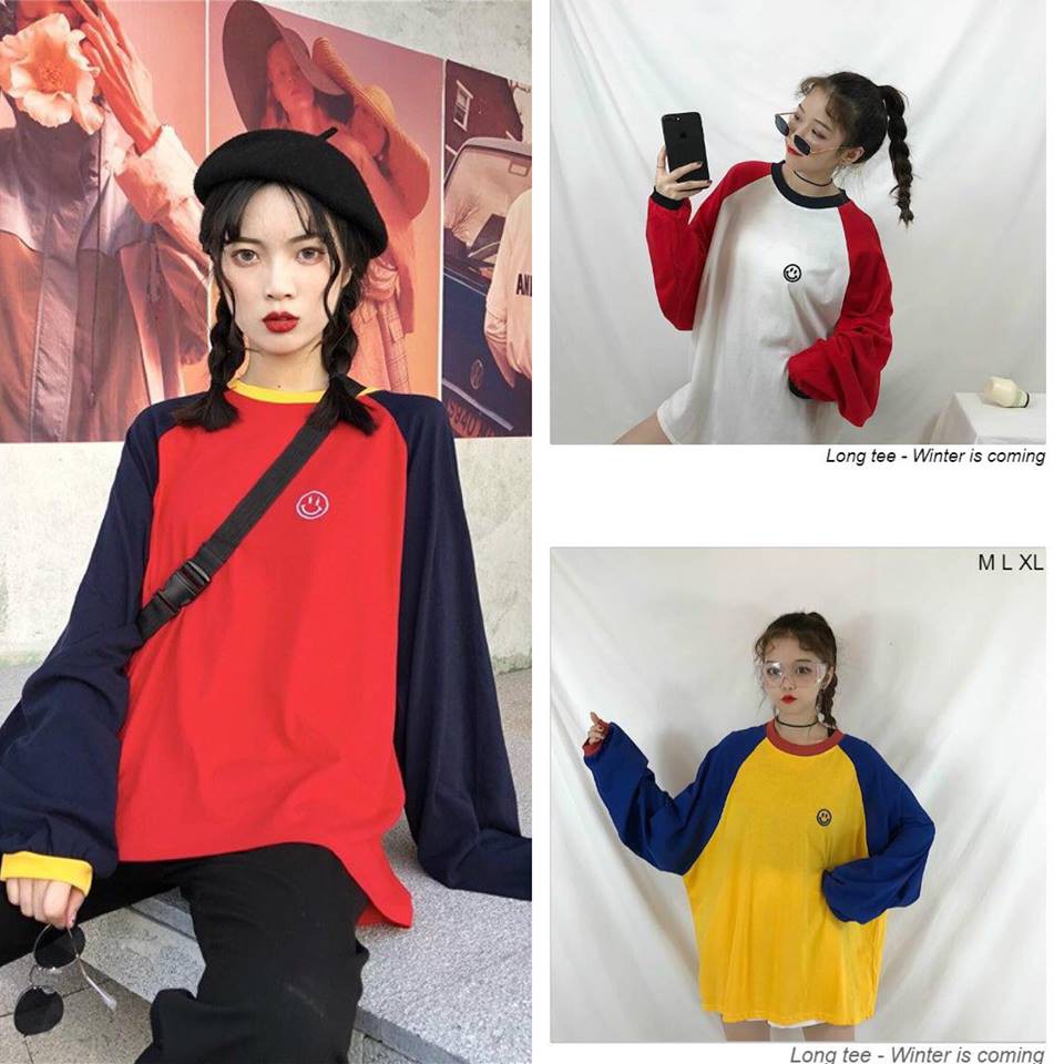 Freeship 99k Toàn Quốc áo Thun Tay Dài Ulzzang Phối Màu In Mặt Cười